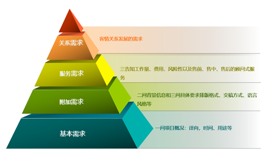 第二層級需求,來自于客戶對于產品的附加需求,比如排版格式、交稿方式、語言風格等,即“二問背景信息和三問具體要求”;