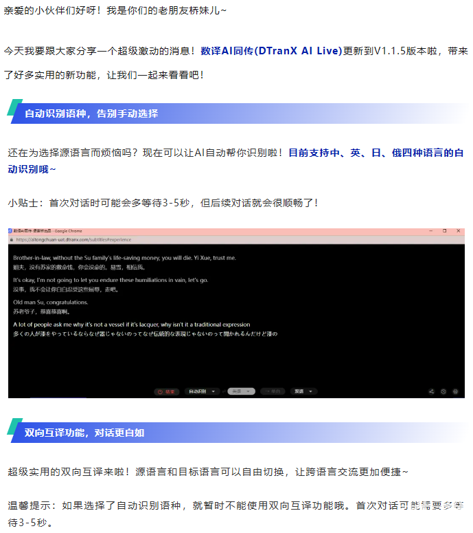"數(shù)譯A同傳又雙叒愛更新啦!上周四我們發(fā)布了最新的V1.1.4版本。本次更新帶來了多項實用功能,讓橋妹兒帶大家一起來看看吧~ "...[查看更多]