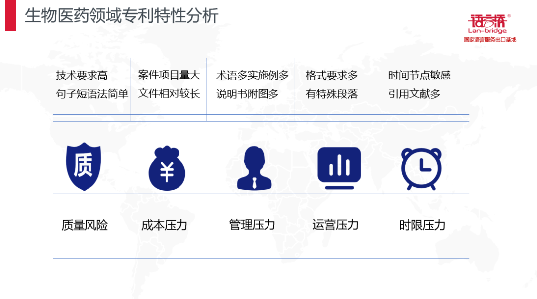 根據(jù)生物醫(yī)藥領(lǐng)域特點帶來的質(zhì)量風險,成本壓力,管理壓力,運營壓力,時限壓力,語言橋采用了定制的譯員服務(wù)團隊,責任清晰的,高質(zhì)量,高一致性的專利翻譯服務(wù),使申請人在得到高質(zhì)量的專利翻譯服務(wù)達到降本增效的同時,也實現(xiàn)國際專利的精細化管理。